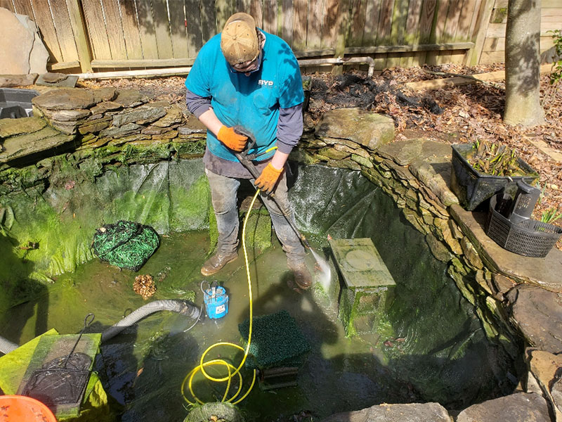 Comprehensive cleaning of pond liners, filters, and pumps.